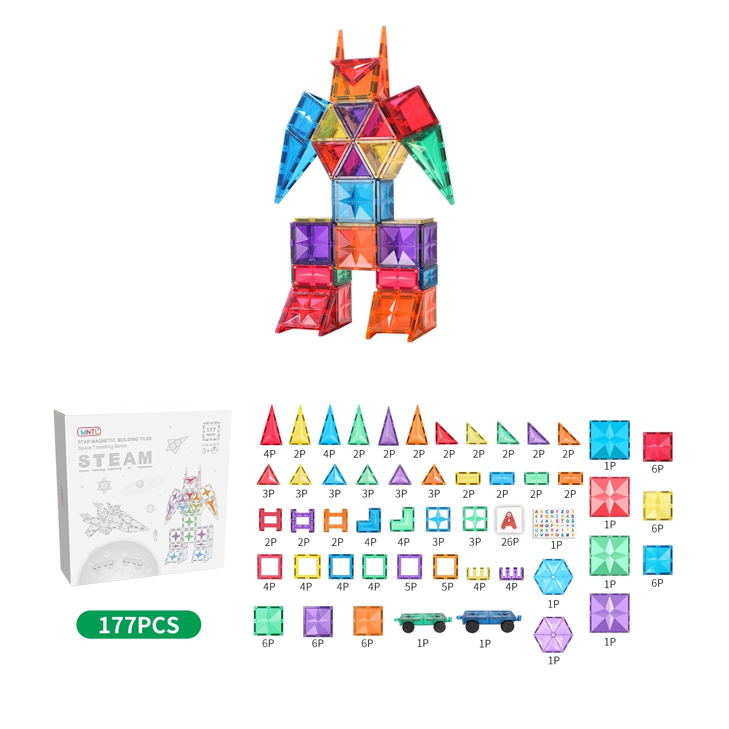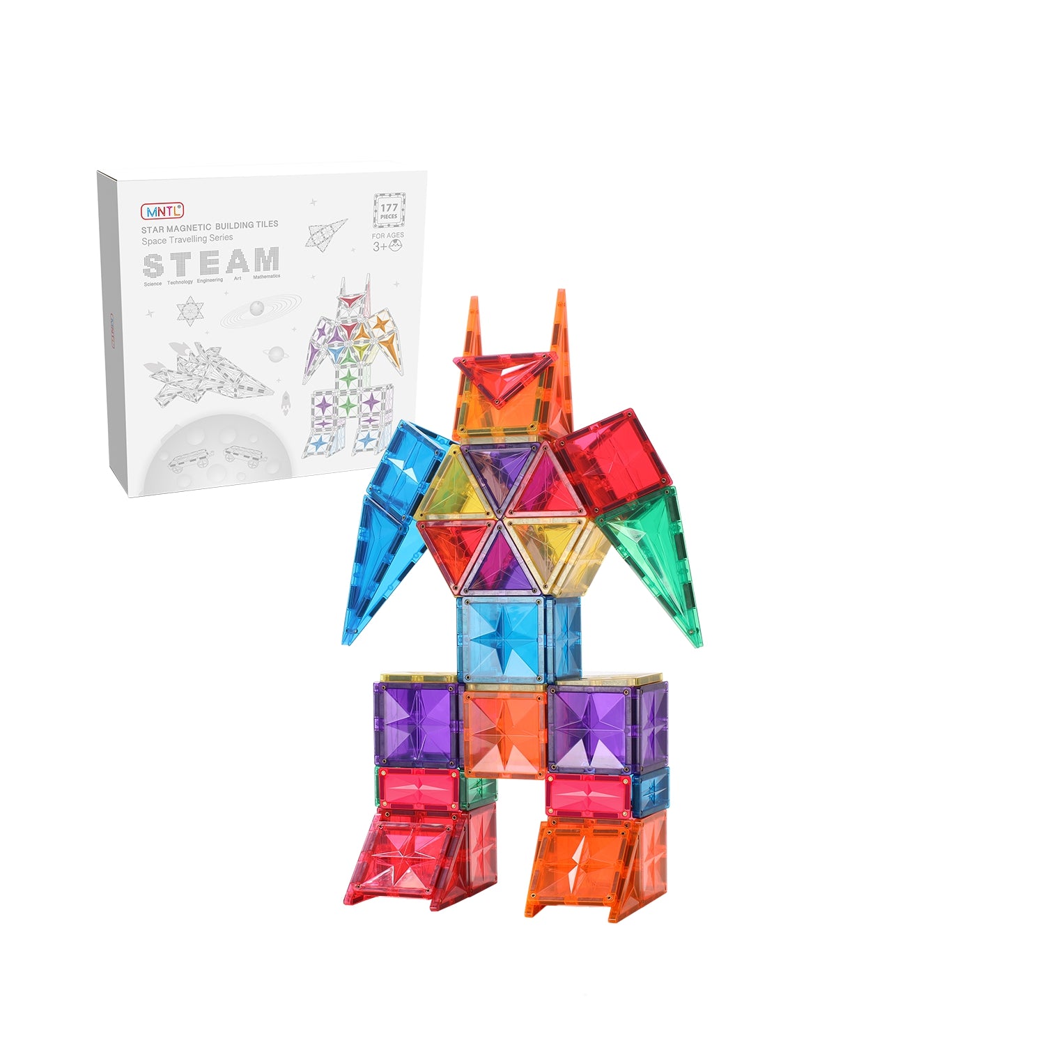 MNTL magnetic tiles feature unique star facet design that provides strong structure, scratch-resistance, and beautiful refraction. Each tile has large magnets to allow children to build taller and bigger structures.