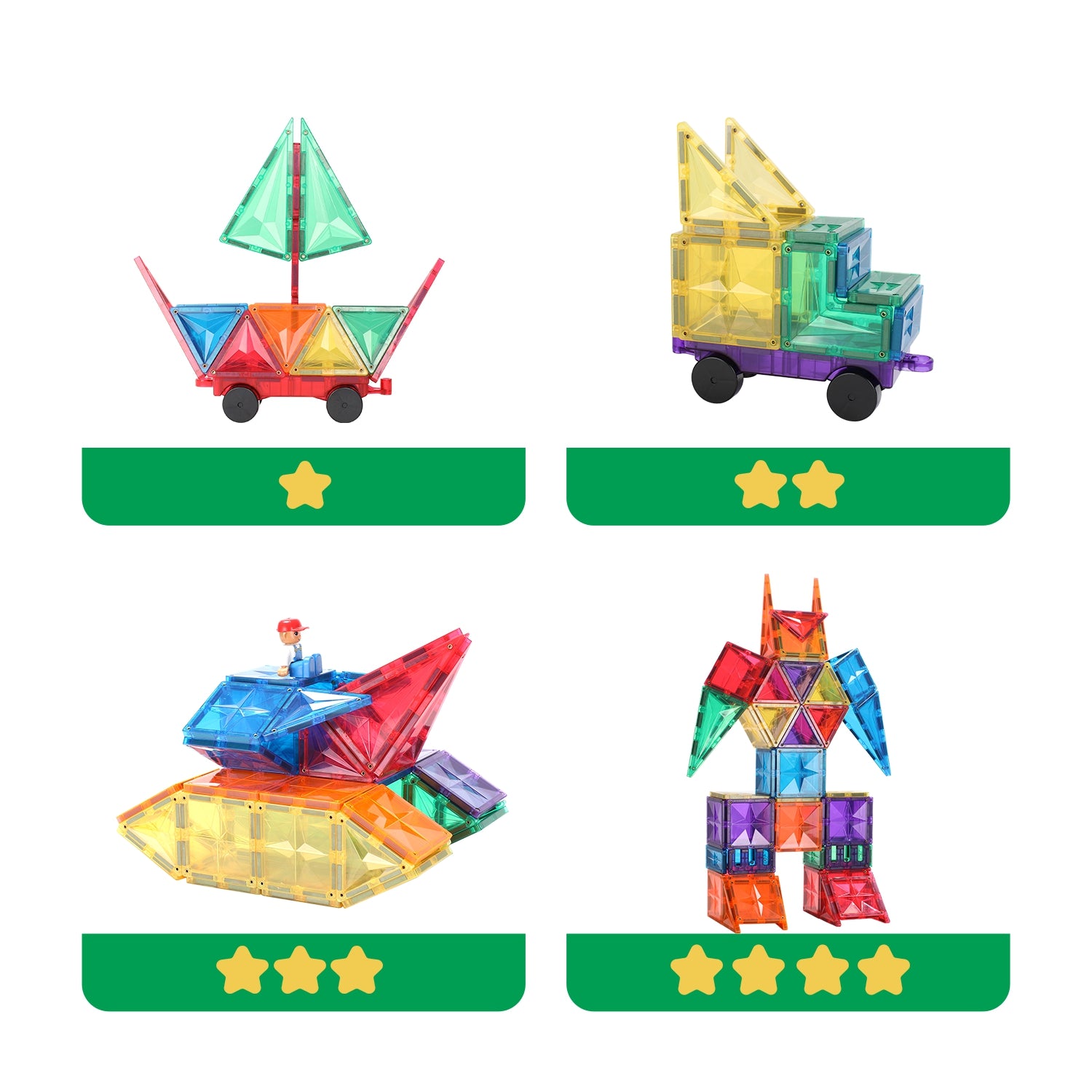 These magnetic star tiles resemble diamond brilliance when they get lights shine over, and are completely translucent, with vivid rainbow colours that won’t fade or become foggy over time. This set includes a mixture of squares, triangles, and a car base perfect for building new and inventive vehicles to drive through your tile town.